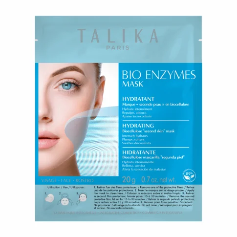 Talika Bio Enzymes Hydrating hidratantna maska za suhu kožu hidratizira, daje punoću, zaglađuje i umiruje kožu. Njezina tajna? Bioceluloza, nanovlakno izrazite čistoće dobiveno enzimatskom fermentacijom kokosove vode, čija 3D struktura zadržava visoku koncentraciju aktivnih sastojaka i optimizira njihovo prodiranje u kožu.