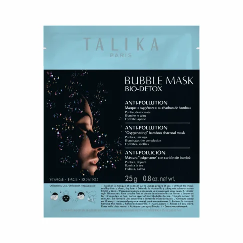 Talika Bio-Detox Bubble Mask oksigenirajuća maska za lice s učinkom protiv onečišćenja iz okoline, pročišćuje, odčepljuje, daje zdravi sjaj, hidrira i umiruje osjetljivu kožu lica. U samo 10 minuta mikromjehurići stvaraju kisik, a ugljen i probiotički ekstrakti oslobađaju kožu od oštećenja uzrokovanog onečišćenjem. Pore su zategnutije, a lice čisto i odiše svježinom.