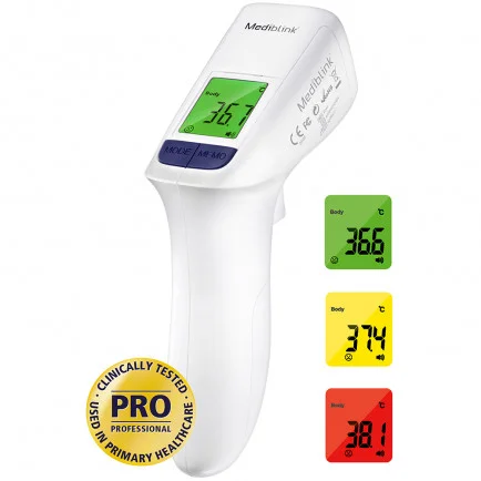 MEDIBLINK Beskontaktni infracrveni toplomjer M340 u manje od dvije sekunde beskontaktno mjeri tjelesnu temperaturu čela (Mod za mjerenje tjelesne temperature) ili temperaturu prostorije, predmeta, tekućine (Mod za mjerenje temperature površina) na udaljenosti između 1 i 5 cm od čela/predmeta/tekućine.