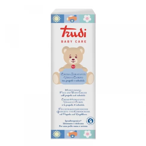 Trudi Hidratantna krema s propolisom, ekstraktom nevena, shea maslacem i uljem badema koja štiti, hidratizira kožu te je čini mekom. Iznimno nježna prema osjetljivoj dječjoj koži, ova hidratantna krema je odlična zaštita prije izlaganja suncu i vjetru koji mogu iziritirati dječju kožu.