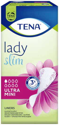 Tena Lady Slim Ultra Mini inkontinencijski tanki uložak iznimno je tanak, ali ima iznimnu sposobnost upijanja za sigurnu i diskretnu zaštitu, onda kada imate slaba istjecanja urina i povremeno kapanje.