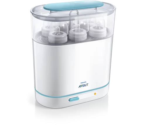 Avent Električni parni sterilizator je odličan praktičan uređaj modernog dizajna za sterilizaciju Avent Classic i Natural bočica za hranjenje beba u kojeg stane do 6 bočica. Sterilizator koristi prirodnu paru koja uništava 99,99% štetnih bacila. Ovaj uređaj omogućuje "zdravu sterilizaciju " bez upotrebe kemikalija. Trajanje sterilizacije je 6 minuta, a bočice ostaju u sterilizatoru sterilne do 24 sata, ako ne otvarate poklopac. Funkcija automatskog isključivanja nakon završetka. Sterilizator je pogodan za sterilizaciju bočica s uskim i širokim grlom, do 330 ml. Jamstvo: 24 mjeseca od dana kupovine.