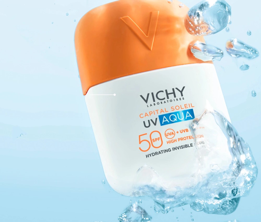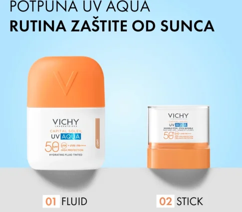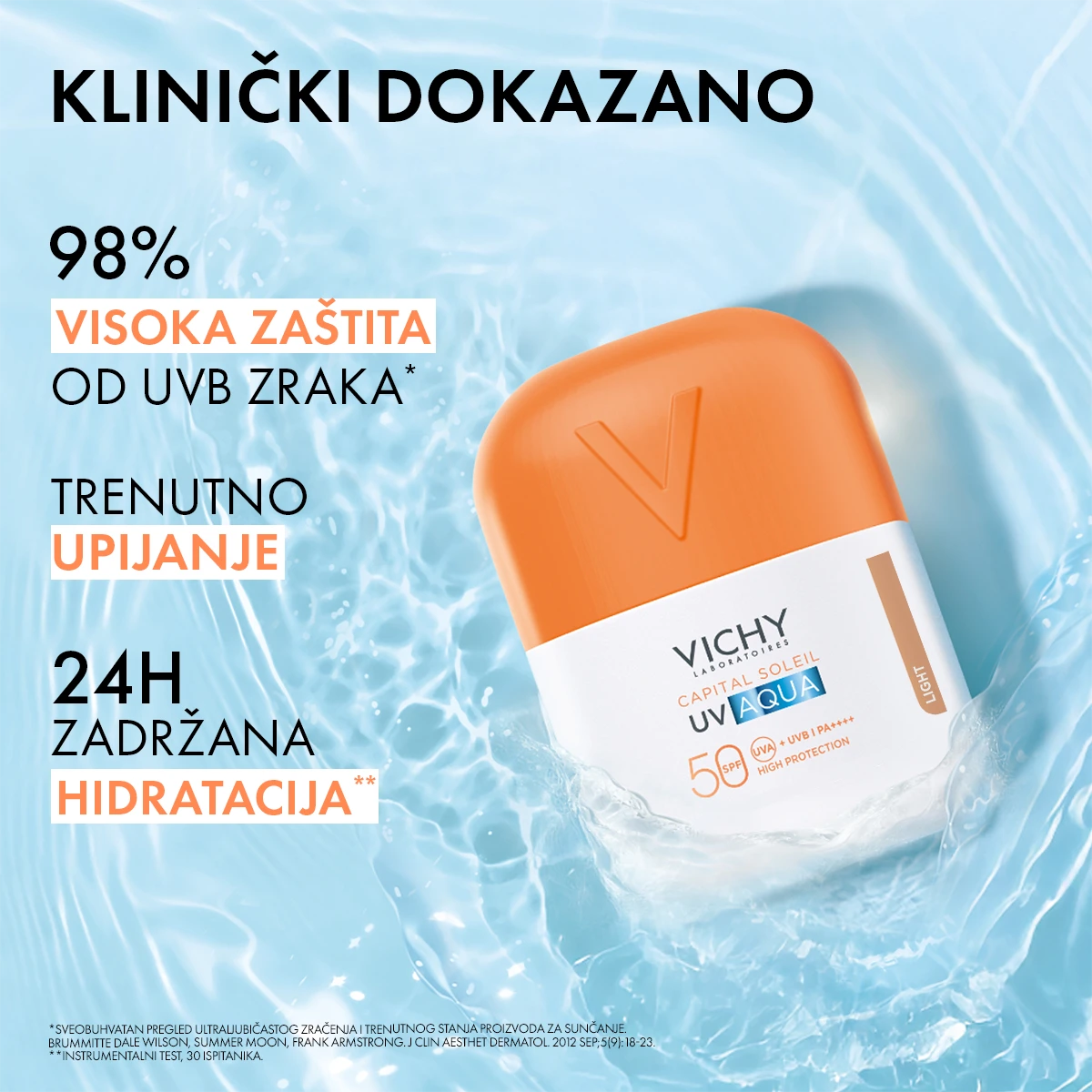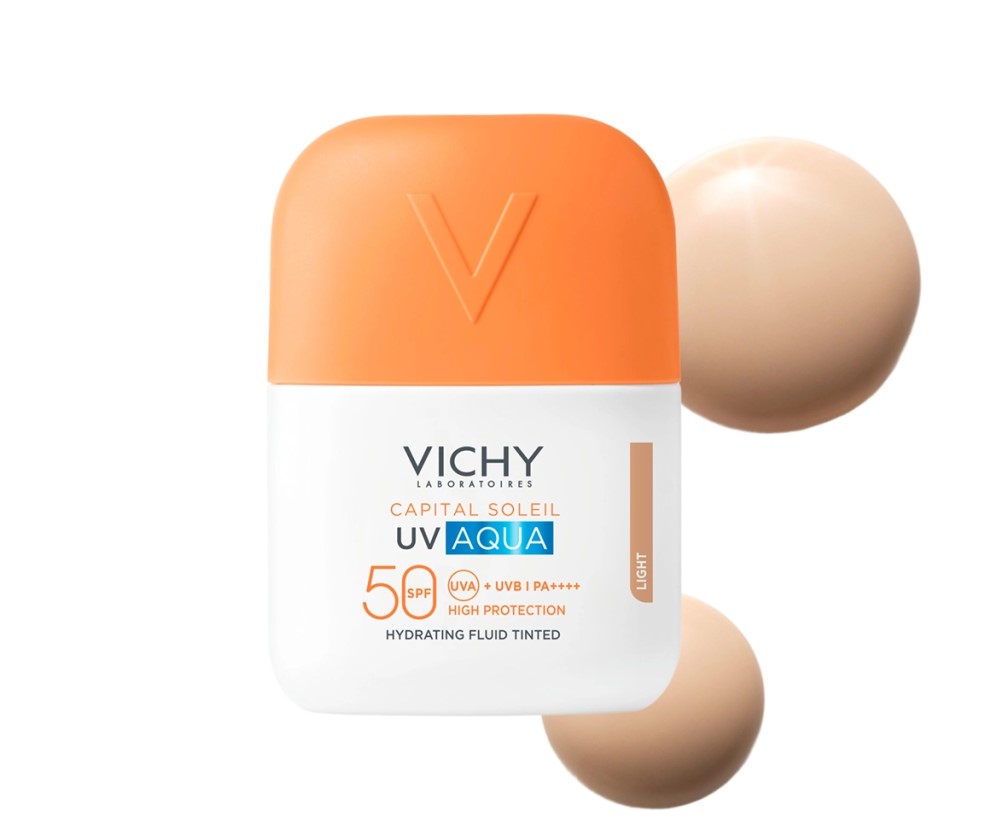 Vichy Capital Soleil SPF50+ UV-AQUA tonirani fluid hidratizira kožu te pruža vrlo visoku zaštitu od sunca. Izjednačava ten.