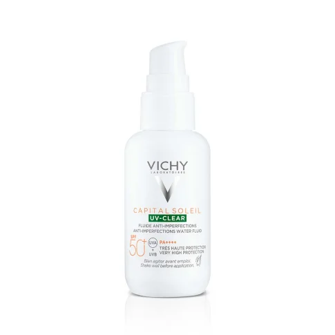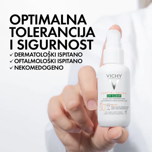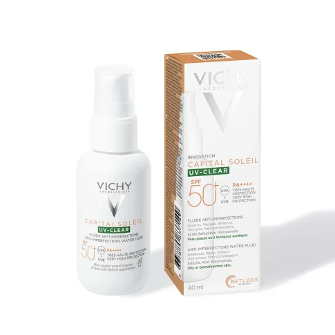 Vichy Capital Soleil UV-CLEAR fluid SPF50+ protiv nepravilnosti uzrokovanih UV zračenjem sadržava tehnologiju netlock i pruža naprednu zaštitu protiv UVA i UVB zračenja sa zaštitnim faktorom 50+.