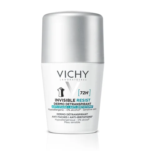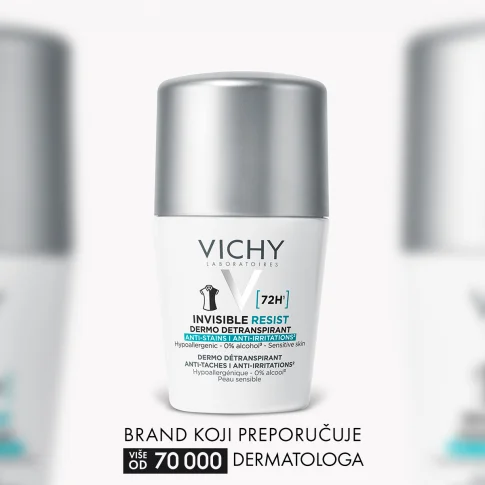 Vichy Invisible Resist 72h dezodorans roll-on zaštita je od znojenja pogodna i za osjetljivu kožu. Ne ostavlja tragove. Bez alkohola. Pogodno nakon brijanja.
