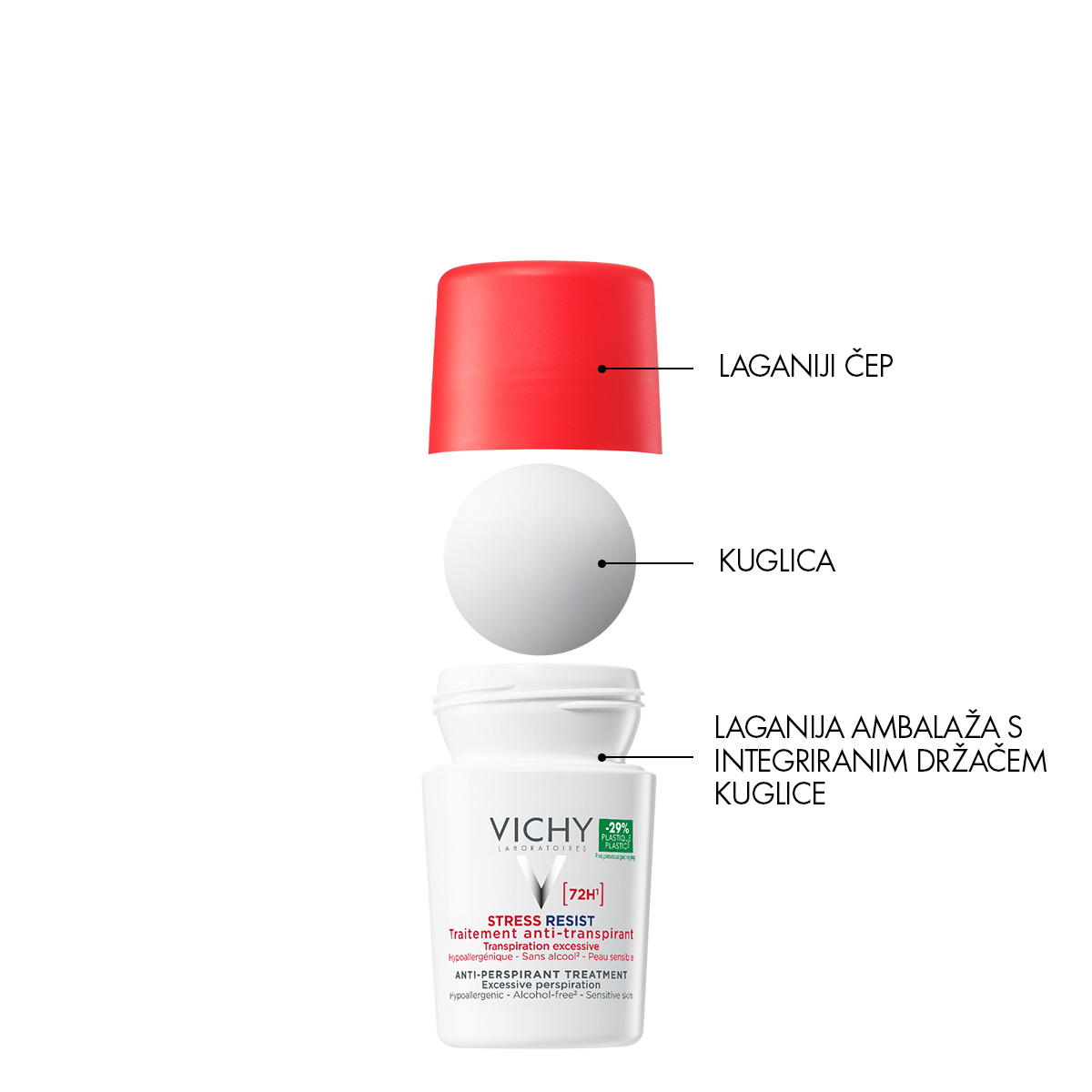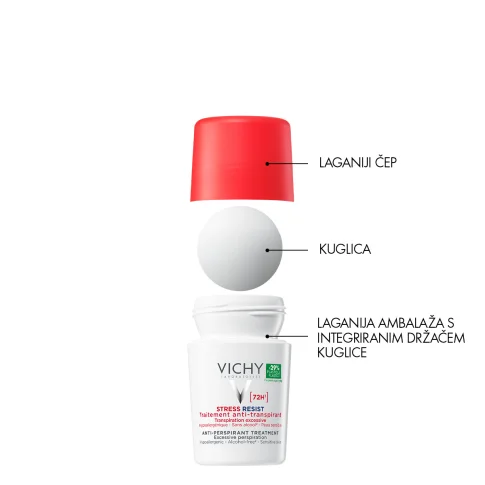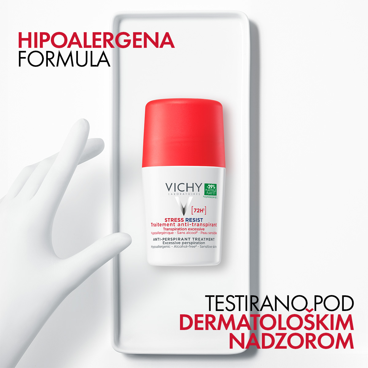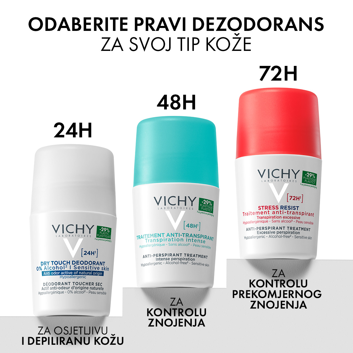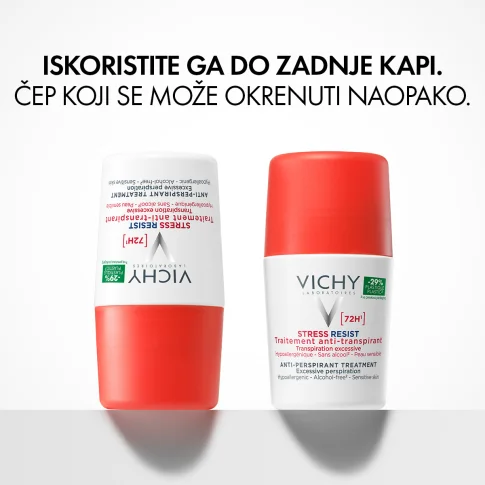 Vichy deodorant Anti-Stress Intenzivni je tretman protiv znojenja, čak i u uvjetima stresa. Za muškarce i žene koji imaju problema s prekomjernim znojenjem i žele kombinaciju iznimne učinkovitosti protiv znojenja i iznimne tolerancije prema koži.