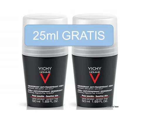 Vichy Homme dezodorans za osjetljivu kožu muškarca bogat je aktivnim sastojcima protiv znojenja i smirujućim oligoelementom cinkom koji regulira znojenje i smiruje kožu od osjećaja neugode tijekom 72h. Njegova hipoalergena formula je bez parabena nježna prema osjetljivoj koži za optimalnu toleranciju te je bez mirisa i alkohola. Vichy Homme deodorant dolazi u formi roll-on-a.