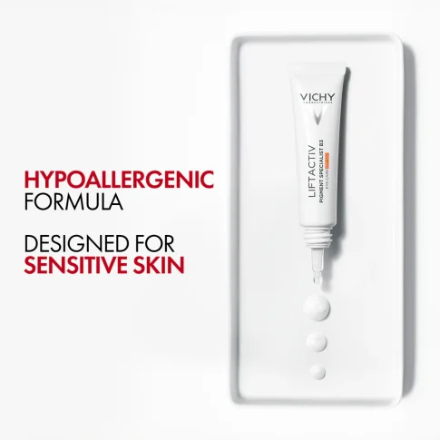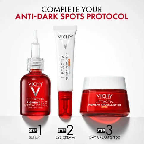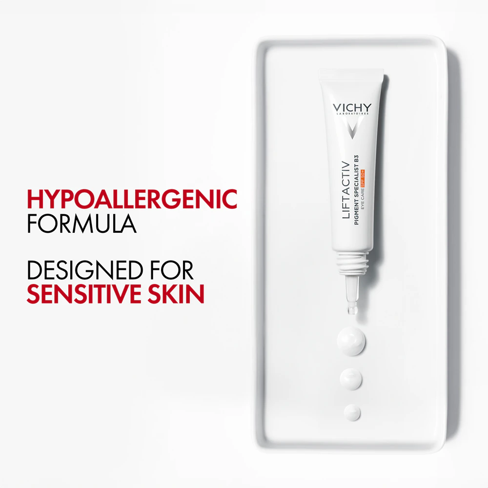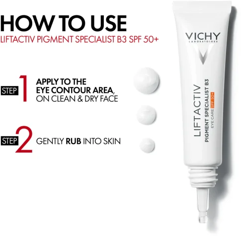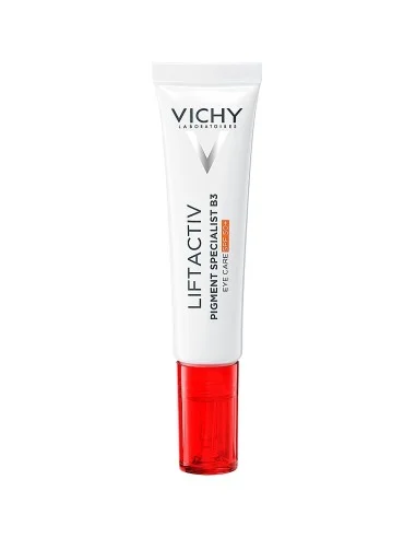 Vichy Liftactiv Pigment Specialist B3 krema za područje oko očiju SPF50+ ciljana je njega razvijena za korekciju tamnih mrlja, bora i neujednačenog tena u osjetljivom području oko očiju. Formula s niacinamidom (vitamin B3) djeluje protiv hiperpigmentacija, dok kolagenski peptidi pomažu u zaglađivanju sitnih linija i bora. Visoka zaštita od UV zraka SPF50+ s mineralnim filtrima štiti kožu od oštećenja izazvanih suncem i sprječava nastanak novih nepravilnosti.