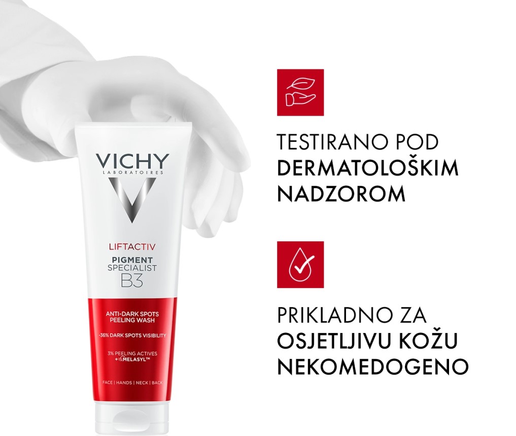 Vichy Liftactiv Pigment Specialist B3 piling gel protiv tamnih mrlja poboljšava kožu jednim pranjem, a samo jedna tuba pilinga smanjuje vidljivost tamnih mrlja.