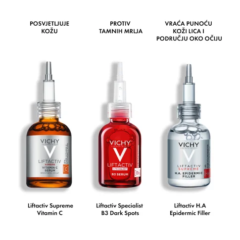 Vichy Liftactiv Supreme Vitamin C serum intenzivna je njega koja jača obranu kože od slobodnih radikala, posvjetljuje i ujednačava ten te ispravlja tanke linije i bore.