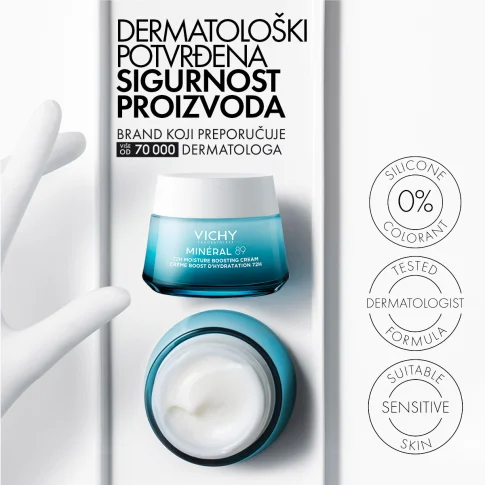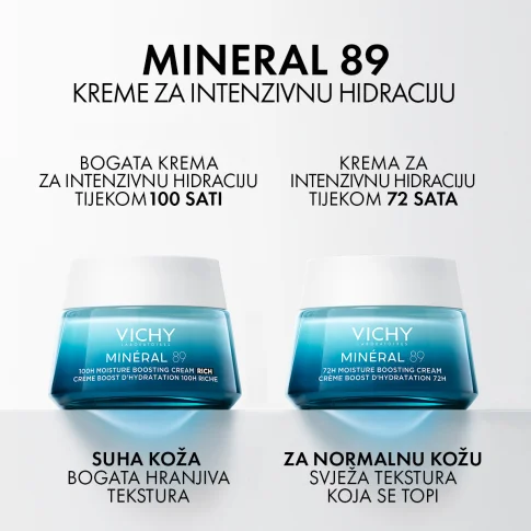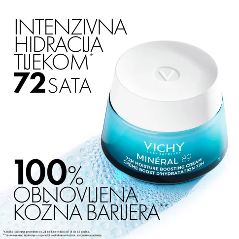 Vichy MINÉRAL 89 72h krema za intenzivnu hidraciju ojačava barijeru kože aktivnim sastojcima koji prodiru kroz 3 sloja epiderme za učinkovitu trodnevnu hidraciju. Njega obuhvaća ključne elemente kože i visoku koncentraciju prirodnih lipida u svježoj i laganoj kremi koja se topi na koži u svrhu povećanja razine lipida u koži, obnove zaštitne barijere kože, zadržavanja vlažnosti i dugotrajnog poboljšanja hidracije do 72 sata.