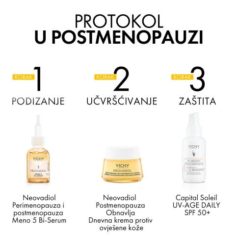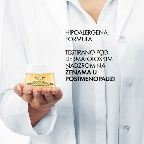Vichy Neovadiol hranjiva dnevna njega za kožu u postmenopauzi reaktivira mladenačke mehanizme kože te vraća čvrstoću, gustoću i smanjuje dubinu i vidljivost bora.