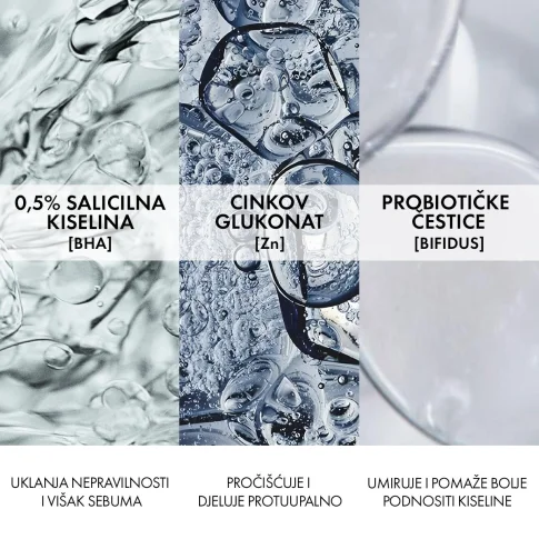 Vichy Normaderm gel za čišćenje za masnu i aknama sklonu kožu obogaćen je mineralima i probiotičkim derivatima koji učinkovito uklanja prljavštinu, prašinu i čestice zagađenja već prvim korištenjem. Koža je u trenu matirana i manje se masti ostatak dana. Proširene pore su smanjene, a miteseri su manje vidljivi.
