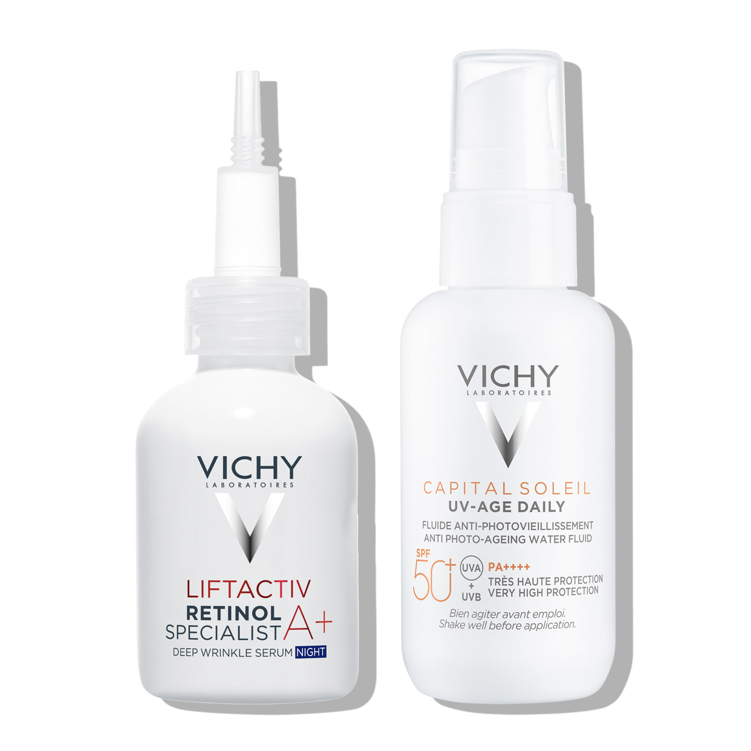Vichy Retinol Protokol protiv izraženih bora i neujednačenog tena kombinacija je seruma s retinolom te zaštite za sunce koji se bore protiv bora i neujednačenosti tena.