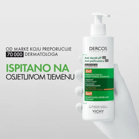 Vichy Dercos 2u1 šampon i regenerator u jednom predstavlja rješenje protiv prhuti za sve tipove kose. Sadrži kombinaciju selen disulfida i hijaluronske kiseline.