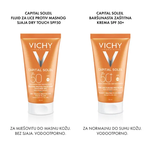 Vichy Capital Soleil Dry Touch Matirajući Fluid za sunčanje SPF50 visoka je zaštita kože od sunca koja ima matirajući učinak namijenjena osjetljivoj koži sklonoj masnom sjaju. Za muškarce i žene sa svijetlom mješovitom do masnom kožom u potrazi za zaštitom od sunca koja ne čini kožu sjajnom.