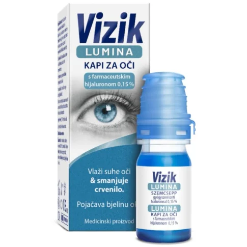 Vizik LUMINA kapi za oči poboljšavaju stanja vlažnosti u oku te osiguravaju da bjeloočnice ponovno izgledaju intenzivnije i bjelije, budući da vlaženje smanjuje učinke trenja na oku i ublažava povezano crvenilo.