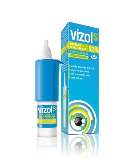Vizol S 0,21% kapi za oči sadrže natrijev hijaluronat u koncentraciji od 0,21%. Trenutno ublažava simptome suhoće oka. Može se koristiti i tijekom nošenja kontaktnih leća. Bez konzervansa. Sigurne su za primjenu do 6 tjedana nakon otvaranja.