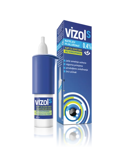Vizol S 0,4% kapi za oči sadrže visoku koncentraciju natrijevog hijaluronata u obliku suze. Lakše se i bolje primjenjuju od gela, a pružaju dugotrajan osjećaj ugode. Trenutno ublažavaju simptome jake suhoće oka te su idealne za noćnu primjenu. Ne sadrže konzervanse te su sigurne za primjenu do 6 mjeseci nakon otvaranja.