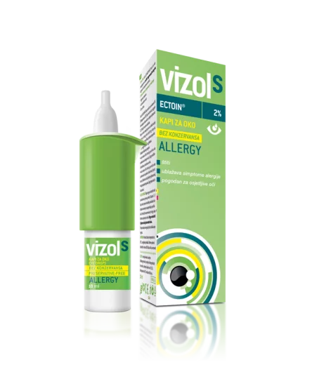 Vizol S Allergy kapi za oči s Ektoinom ublažavaju simptome alergije i djeluju preventivno kod izloženosti različitim alergijama. Štite oko od štetnog djelvoanja alergena i smanjuju nadraženost sluznice oka. Mogu se koristiti i uz nošenje kontaktnih leća. Bez konzervansa. Sigurne su za primjenu do 6 tjedana nakon otvaranja.