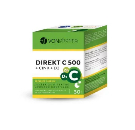 VONpharma DIREKT C500 + CINK + D3 vrećice dodatak su prehrani za jačanje imuniteta koji sadrže vitamin C, Cink i Vitamin D3. Ova tri sastojka zajedno doprinose normalnom funkcioniranju našeg imunološkog sustava.