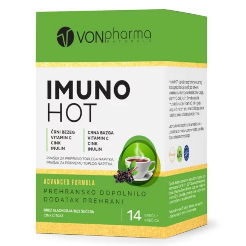 VONpharma IMUNO HOT za imunitet topljiv je, topli napitak bez šećera koji podržava imunološki sustav i obranu tijela. Radi se o prahu za pripremu ukusnog toplog napitka koji sadrži jedinstvenu kombinaciju 4 sastojka: ekstrakt crne bazge, vitamin C, cink, inulin.