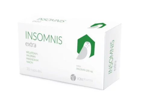 VONpharma Insomnis Extra kapsule dodatak su prehrani s melatoninom, magnezijem i valerijanom koji pomaže kod nesanice i problema s usnivanjem.