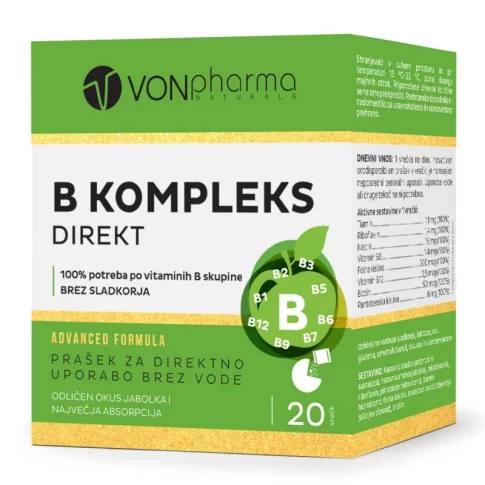 VONpharma B KOMPLEKS Direkt vrećice izravno sadrže jedinstvenu kombinaciju svih vitamina B skupine u dozi koja osigurava 100% potrebe za svim vitaminima B skupine u ugodnom i ukusnom obliku.
