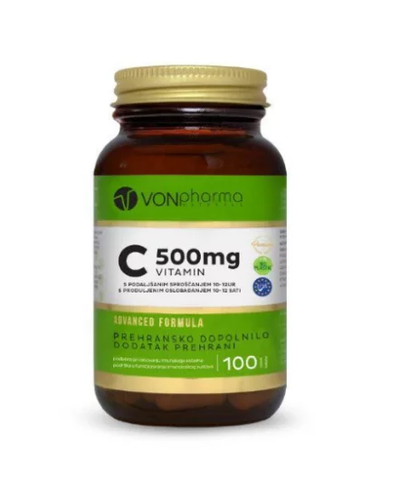VONpharma VITAMIN C 500mg dodatak je prehrani s vitaminom C inovativne tehnologije produljenog oslobađanja čak 10 - 12 sati. To je najdulje produljeno oslobađanje na tržištu i u skladu je s farmaceutskim standardima.
