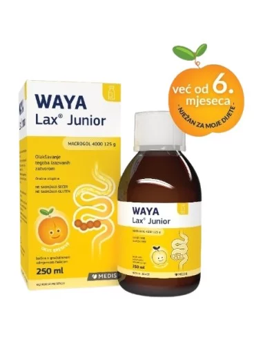 WAYA Lax Junior je oralna otopina, medicinski je proizvod na bazi makrogola 4000 koji nježno i učinkovito rješava zatvor, osmotskim mehanizmom regulira rad crijeva i ublažava probleme uzrokovane zatvorom.