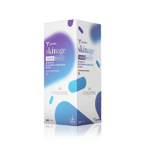 Yasenka Skinage Hair boost tekući je dodatak prehrani koji sadrži moćnu kombinaciju Cynateine HNS, vitamina B kompleksa u 100% preporučenim dnevnim dozama i cinka, te time jača kosu, ubrzava njen rast i smanjuje ispadanje.