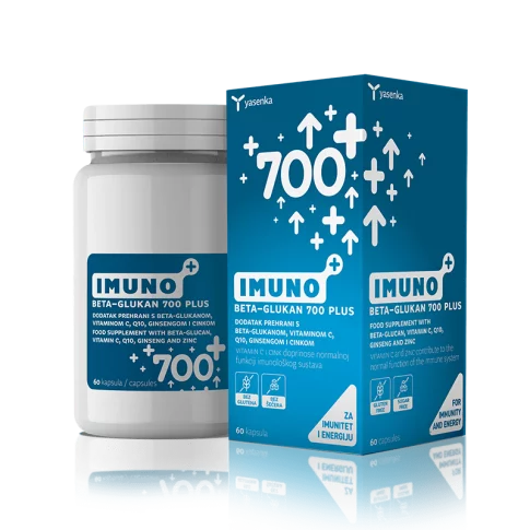 Yasenka Imuno Beta glukan 700 Plus kapsule dodatak su prehrani s beta glukanom, vitaminom C, Q10, ginsengom i cinkom za energiju, imunitet i koncentraciju.
