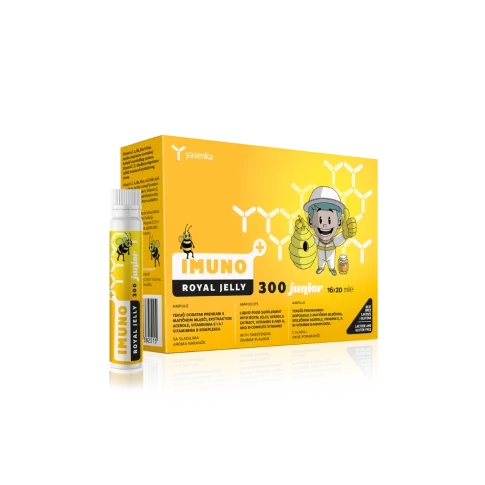Yasenka Imuno Royal Jelly 300 Junior ampule dodatak su prehrani s matičnom mliječi, ekstraktom acerole, vitaminima E i A te vitaminima B kompleksa. Prirodna su super hrana za djecu od 3 godine.