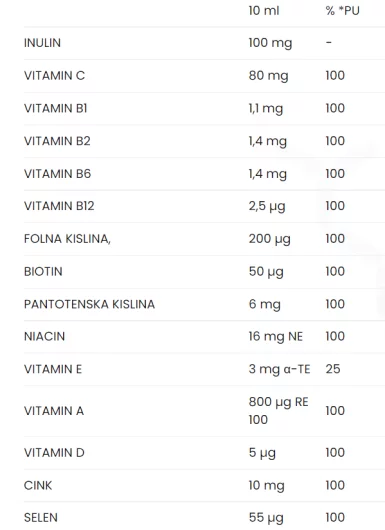 Uz jak vitaminsko–mineralni status multivitamin sadrži 100 mg inulina koji služi kao izvor hrane korisnim bakterijama te povećava apsorpciju hranjivih tvari u crijevima i samim time održava crijevnu floru zdravom i funkcionalnom.