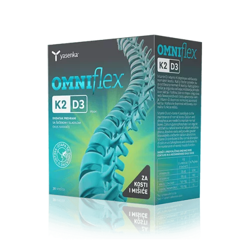 Yasenka Omniflex K2D3 vrećice dodatak je prehrani s vitaminima K2 i D3, koji pomaže zdravlju kostiju, mišića i zglobova.