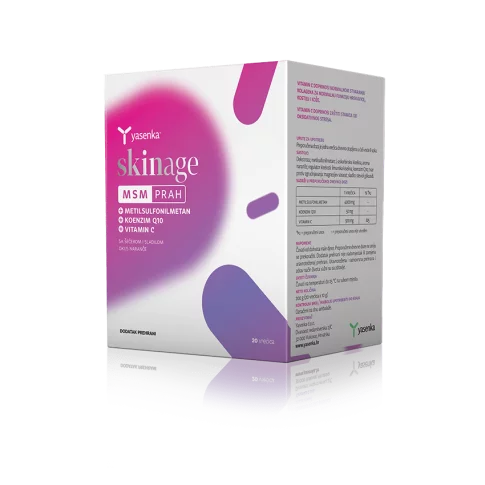Yasenka Skinage MSM prah vrećice dodatak su prehrani s visokim koncentracijama sastojaka u jednoj dozi koji dokazano smanjuju broj, dubinu i duljinu bora već u 8 tjedana. Zahvaljujući sinergističkom djelovanju MSM-a, vitamina C i Q10 bore su smanjene, koži je vraćena elastičnost i energija.