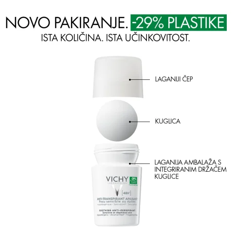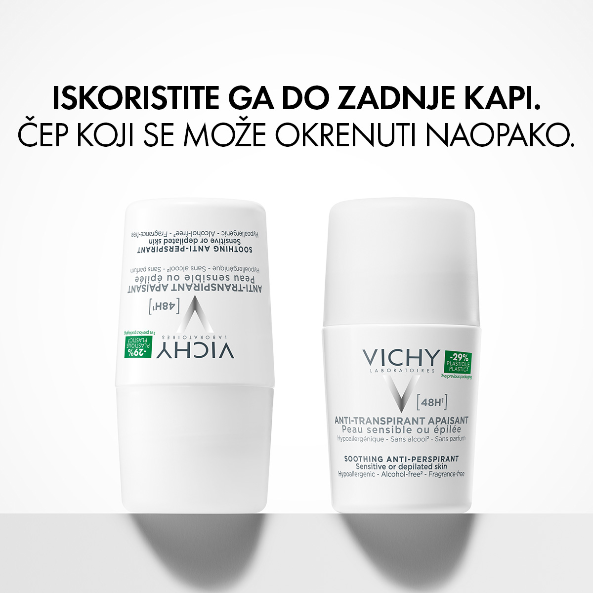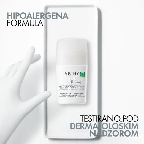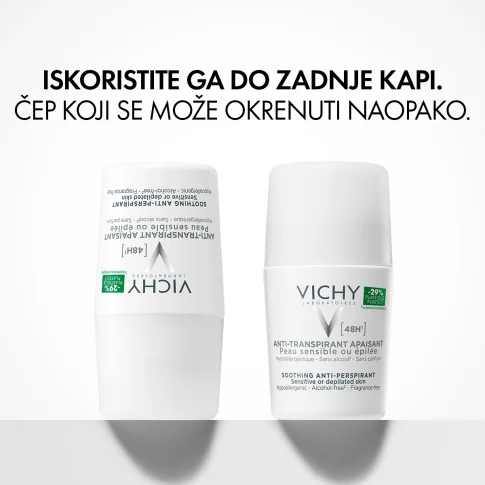 Vichy Déodorant Roll-on za osjetljivu kožu pruža 48-satnu učinkovitost u sprječavanju prekomjernog znojenja bez bijelih tragova i žutih mrlja i oštećivanja odjeće.