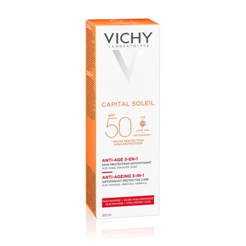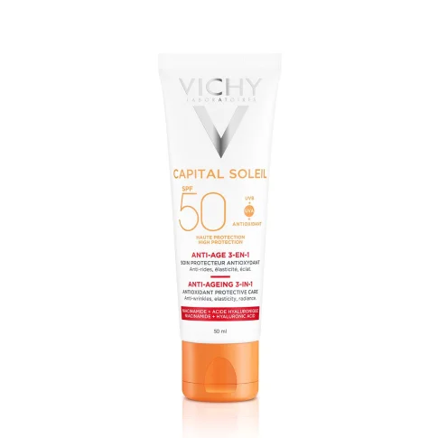 Vichy Ideal Soleil zaštitna krema pruža vrlo visoku zaštitu od sunca. Sadrži SPF50+. Aktivni sastojci djeluju anti-age te usporavaju starenje kože: smanjuju bore i nastanak tamnih mrlja.