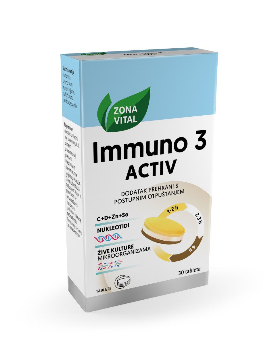 Zona vital IMMUNO 3 ACTIV tablete za jačanje imuniteta sadrže cink, selen, vitamine D3, B6 i C koji doprinose normalnoj funkciji imunosnog sustava. Sadrži žive kulture mikroorganizama.