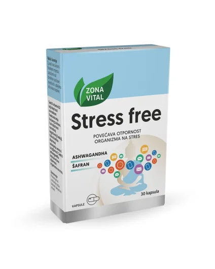Zona vital STRESS FREE kapsule dodatak su prehrani sa suhim ekstraktom ashwagandhe, ekstraktom šafrana, cinkom, vitaminom B2 i folnom kiselinom.