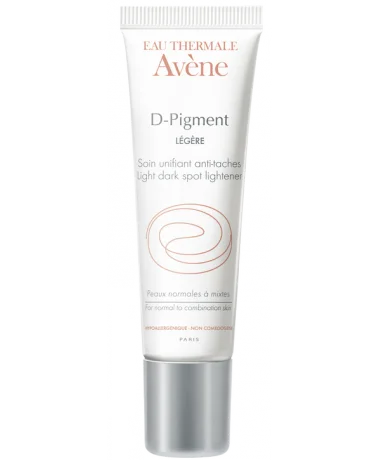 Avene D-Pigment legere krema namjenjena je za posvjetljivanje smeđih i tamnih mrlja. Kombinacija aktivnih sastojaka Melanida, Pre-tokoferila i Retinaldehida izvrsno djeluju na smanjenje epidermalne pigmentacije. Ujednačava boju tena. Prilagođena je normalnoj do mješovitoj koži.