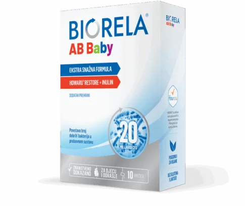 Biorela AB Baby dodatak je prehrani za povećanje broja dobrih bakterija u crijevima. Sadrži HOWARU® RESTORE kombinaciju sojeva laktobacila i bifidobakterija u visokoj dozi od 20 milijardi dobrih bakterija koje se prirodno nalaze u crijevima i 350 mg prehrambenog vlakna inulin, koje služi kao hrana dobrim bakterijama koje nastanjuju naš probavni sustav.