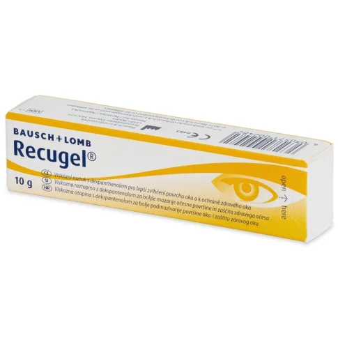 Recugel sadrži i polimer karbomer koji služi kao depo vode. Zahvaljujući takvom sastavu, upotrebljava se kod svih stanja kod kojih je potrebno pospješiti i ubrzati regeneraciju ili cijeljenje rožnice i spojnice oka. Osim toga vlaži i mehanički štiti očnu površinu te osvježava i umiruje oči.