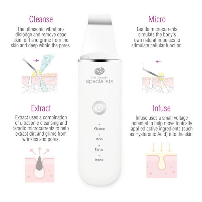 Otkrijte iskustvo dubinskog čišćenja koje koristi ultrazvučnu tehnologiju ne samo za uklanjanje nečistoća, već i za temeljito čišćenje pora. Visokofrekventne vibracije dubinski čiste kožu i ljušte mrtve stanice kože, otkrivajući glatkiji i blistaviji ten.